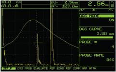 lDGS(距離增益尺寸)選項顯示了特殊等效參考缺陷尺寸曲線,作為測量25個窄頻探頭從探頭到參考缺陷距離的功能。ERS(等效參考缺陷尺寸)功能可自動計算測量門內任何回波的相應等效參考缺陷的直徑(單位為毫米或英寸)。
