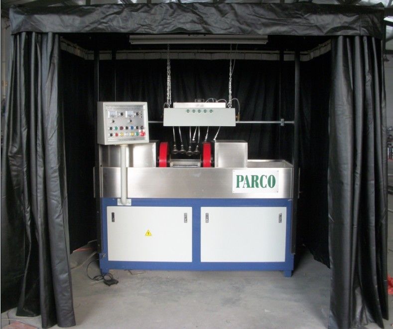 磁懸液噴灑及回收系統(tǒng)由積液斗、儲液箱、噴液泵、攪拌泵、管道、噴淋頭、濾網(wǎng)等部分組成,對工件進(jìn)行噴淋、積液、濾清、回收以便循環(huán)使用。噴淋頭安裝在床身的前側(cè),自上而下對工件進(jìn)行噴淋,每路噴淋頭均設(shè)有調(diào)節(jié)閥,保證工件充分濕潤而液體不飛濺。攪拌泵電機(jī)使磁懸液中的磁粉充分懸浮防止磁粉沉結(jié),同時亦用于床身右端的手動噴槍的噴淋,手動噴淋由軟管接出,便于手動操作。配備兩道過濾裝置,可防止污染,確保磁懸液的潔凈;承載磁懸液的容器和積液斗均為奧氏體不銹鋼材料,其容積約為40升。